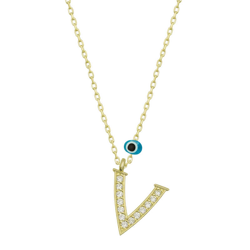 Silver Evil Eye Gold Letter V Women's Necklace With silver letter necklaces, those who are precious to you are always with you... Decorate your loved one's neck with love with this special necklace model that young lovers can choose on special occasions. A silver letter necklace that your loved ones will wear with pleasure will be one of the most meaningful gifts. The evil-eye letter women's necklace model is made of 925 sterling silver. Gold plated on silver. Gold plated silver women's necklace models preserve their shine for a long time. As with all of our products, the silver women's letter necklace model is produced by hand. Due to silver and precious stones, there may be ± 10% deviation from the average product weight. Width: 0.80 cm Length: 1.10 cm Avg. Weight: 1.40 g