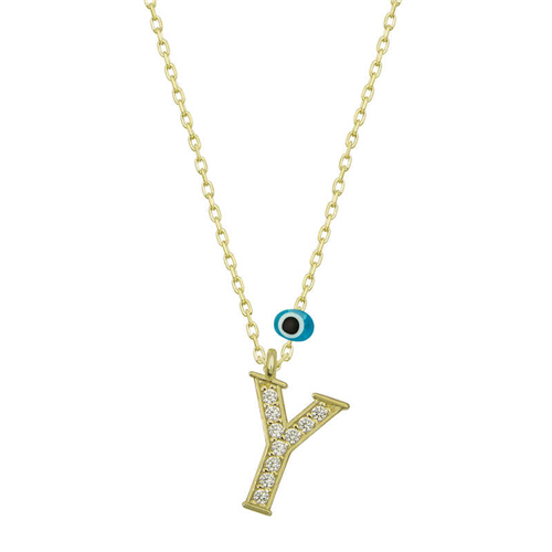Silver Evil Eye Gold Letter Y Women's Necklace With silver letter necklaces, those who are precious to you are always with you... Decorate your loved one's neck with love with this special necklace model that young lovers can choose on special occasions. A silver letter necklace that your loved ones will wear with pleasure will be one of the most meaningful gifts. The evil-eye letter women's necklace model is made of 925 sterling silver. Gold plated on silver. Gold plated silver women's necklace models preserve their shine for a long time. As with all of our products, the silver women's letter necklace model is produced by hand. Due to silver and precious stones, there may be ± 10% deviation from the average product weight. Width: 0.80 cm Length: 1.10 cm Avg. Weight: 1.40 g