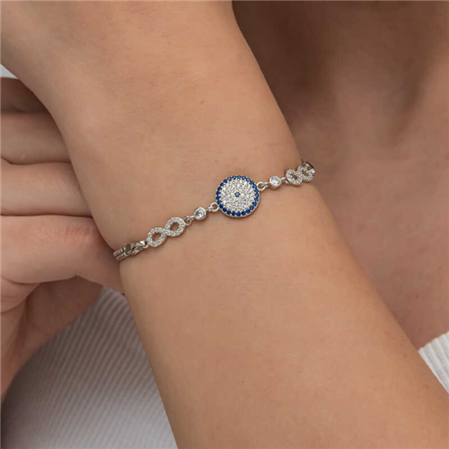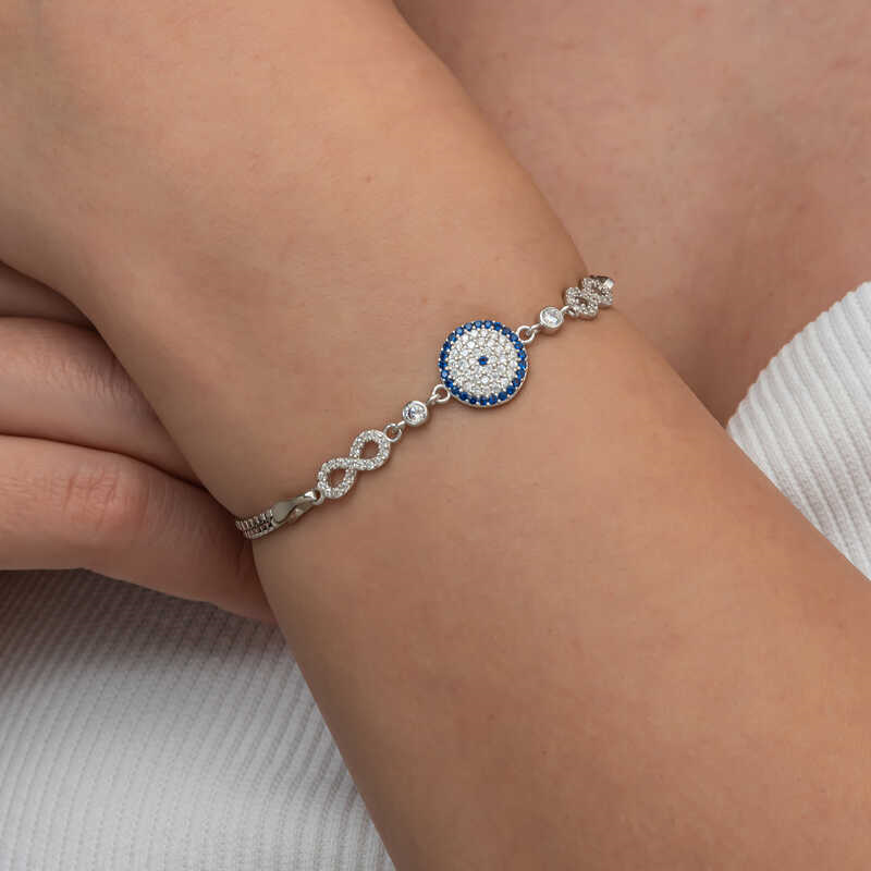 Silver Evil Eye Infinity Women's Bracelet While the evil eye bead aims to keep bad energies and the evil eye away, the infinity symbol symbolizes eternal love, friendship and devotion. This stylish bracelet is a perfect option for a birthday gift, Valentine's Day gift or a gift for mothers on special occasions. The bracelet is made of 925 sterling silver. Rhodium plated silver. Rhodium plated products preserve their shine for a long time and oxidation is delayed. Like all silver bracelets, this silver evil eye infinity women's bracelet is also entirely handmade. Due to silver and precious stones, there may be a ± 10% deviation in the average product weight. Infinity Diameter: 1 cm Evil Eye Diameter: 1 cm Chain Length: 20.00 cm Average Weight: 5.20 gr.