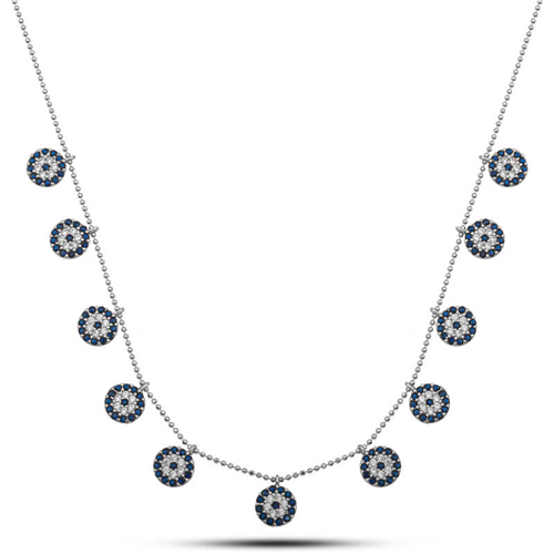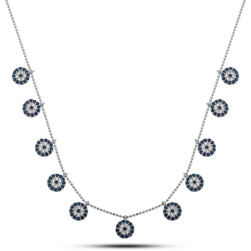 Silver Evil Eye Luck Women's Necklace The silver evil eye bead is a model that you can easily use in daily life with its simple design. The evil eye bead protects you from evil eyes. The stones on this stylish silver necklace model are zircon. Rhodium plated to delay oxidation and preserve its shine for a long time. The average chain length, which is completely silver, is 45 cm. This evil eye luck necklace model is handmade. Due to silver and precious stones, there may be ± 10% deviation from the average product weight. Evil Eye Diameter: 0.70 cm Chain Length: 45 cm Average weight: 5.20 gr