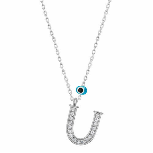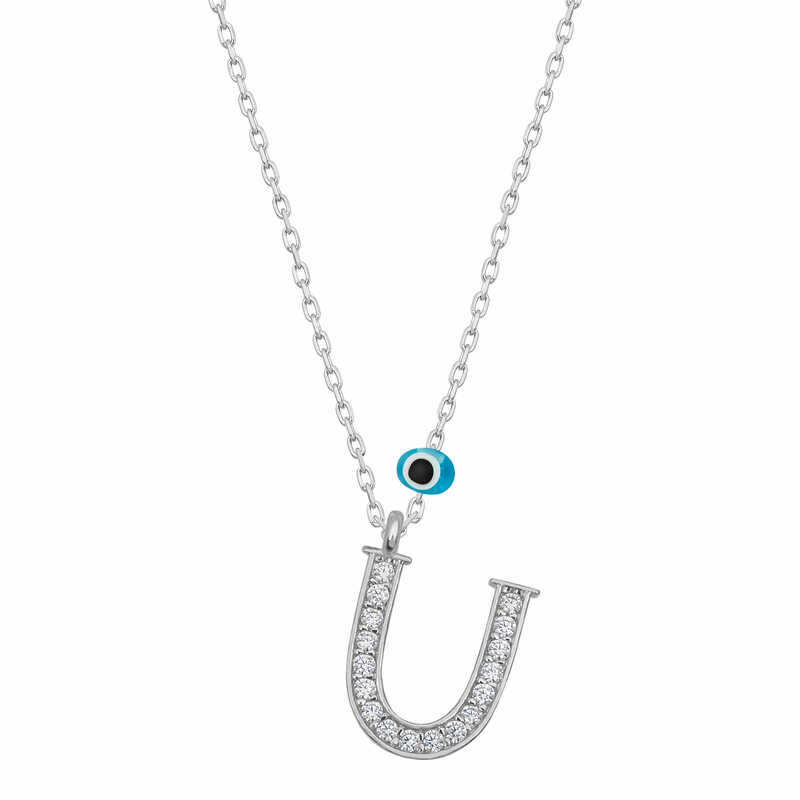 Silver Evil Eye Rhodium Letter U Women's Necklace With silver letter necklaces, those who are precious to you are always with you... Decorate your loved one's neck with love with this special necklace model that young lovers can choose on special occasions. A silver letter necklace that your loved ones will wear with pleasure will be one of the most meaningful gifts. The evil eye letter women's necklace model is made of 925 sterling silver. Rhodium plated silver. Rhodium plated silver women's necklace models preserve their shine for a long time. As with all of our products, the silver women's letter necklace model is handmade. Due to silver and precious stones, there may be ± 10% deviation from the average product weight. Width: 0.80 cm Length: 1.10 cm Avg. Weight: 1.40 gr