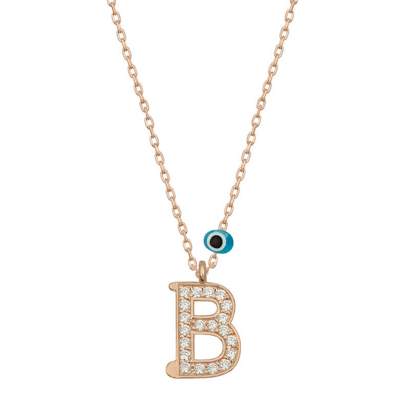 Silver Evil Eye Rose Letter B Women's Necklace With silver letter necklaces, those who are precious to you are always with you... Decorate your loved one's neck with love with this special necklace model that young lovers can choose on special occasions. A silver letter necklace that your loved ones will wear with pleasure will be one of the most meaningful gifts. The evil eye letter women's necklace model is made of 925 sterling silver. Rose plated silver. Rose plated silver women's necklace models preserve their shine for a long time. As with all of our products, the silver women's letter necklace model is handmade. Due to silver and precious stones, there may be ± 10% deviation from the average product weight. Width: 0.80 cm Length: 1.10 cm Avg. Weight: 1.40 gr