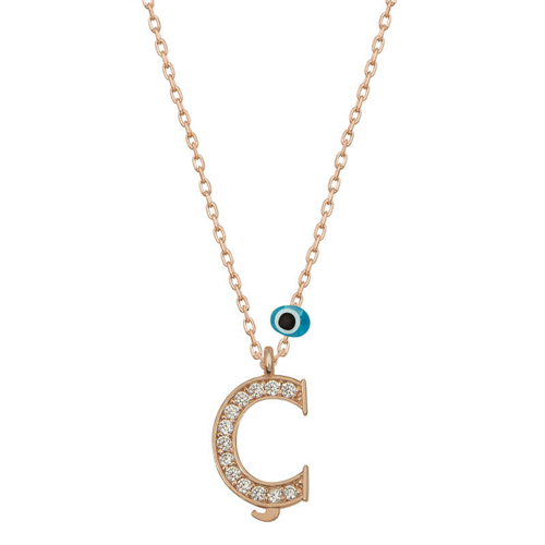 Silver Evil Eye Rose Letter C Women's Necklace With silver letter necklaces, those who are precious to you are always with you... Decorate your loved one's neck with love with this special necklace model that young lovers can choose on special occasions. A silver letter necklace that your loved ones will wear with pleasure will be one of the most meaningful gifts. The evil eye letter women's necklace model is made of 925 sterling silver. Rose plated silver. Rose plated silver women's necklace models preserve their shine for a long time. As with all of our products, the silver women's letter necklace model is handmade. Due to silver and precious stones, there may be ± 10% deviation from the average product weight. Width: 0.80 cm Length: 1.10 cm Avg. Weight: 1.40 gr
