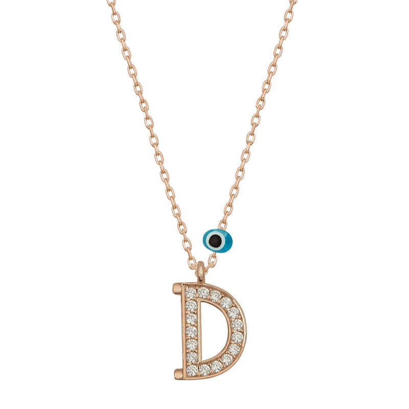 Silver Evil Eye Rose Letter D Women's Necklace With silver letter necklaces, those who are precious to you are always with you... Decorate your loved one's neck with love with this special necklace model that young lovers can choose on special occasions. A silver letter necklace that your loved ones will wear with pleasure will be one of the most meaningful gifts. The evil eye letter women's necklace model is made of 925 sterling silver. Rose plated silver. Rose plated silver women's necklace models preserve their shine for a long time. As with all of our products, the silver women's letter necklace model is handmade. Due to silver and precious stones, there may be ± 10% deviation from the average product weight. Width: 0.80 cm Length: 1.10 cm Avg. Weight: 1.40 gr