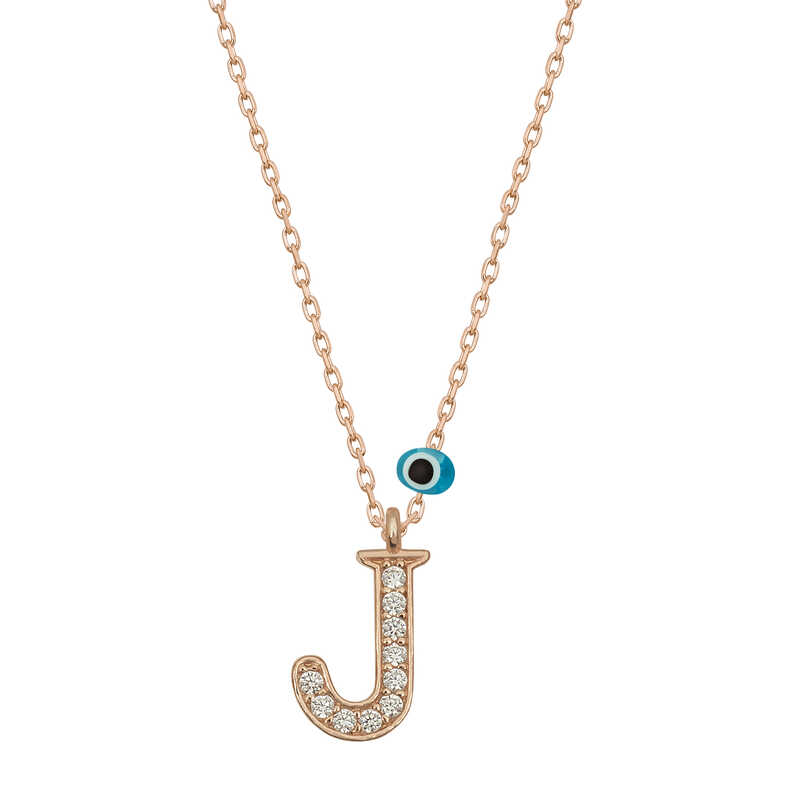 Silver Evil Eye Rose Letter J Women's Necklace With silver letter necklaces, those who are precious to you are always with you... Decorate your loved one's neck with love with this special necklace model that young lovers can choose on special occasions. A silver letter necklace that your loved ones will wear with pleasure will be one of the most meaningful gifts. The evil eye letter women's necklace model is made of 925 sterling silver. Rose plated silver. Rose plated silver women's necklace models preserve their shine for a long time. As with all of our products, the silver women's letter necklace model is handmade. Due to silver and precious stones, there may be ± 10% deviation from the average product weight. Width: 0.80 cm Length: 1.10 cm Avg. Weight: 1.40 gr