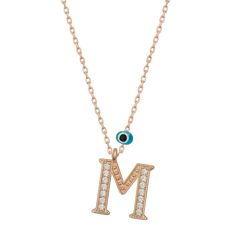 Silver Evil Eye Rose Letter M Women's Necklace With silver letter necklaces, those who are precious to you are always with you... Decorate your loved one's neck with love with this special necklace model that young lovers can choose on special occasions. A silver letter necklace that your loved ones will wear with pleasure will be one of the most meaningful gifts. The evil eye letter women's necklace model is made of 925 sterling silver. Rose plated silver. Rose plated silver women's necklace models preserve their shine for a long time. As with all of our products, the silver women's letter necklace model is handmade. Due to silver and precious stones, there may be ± 10% deviation from the average product weight. Width: 0.80 cm Length: 1.10 cm Avg. Weight: 1.40 gr