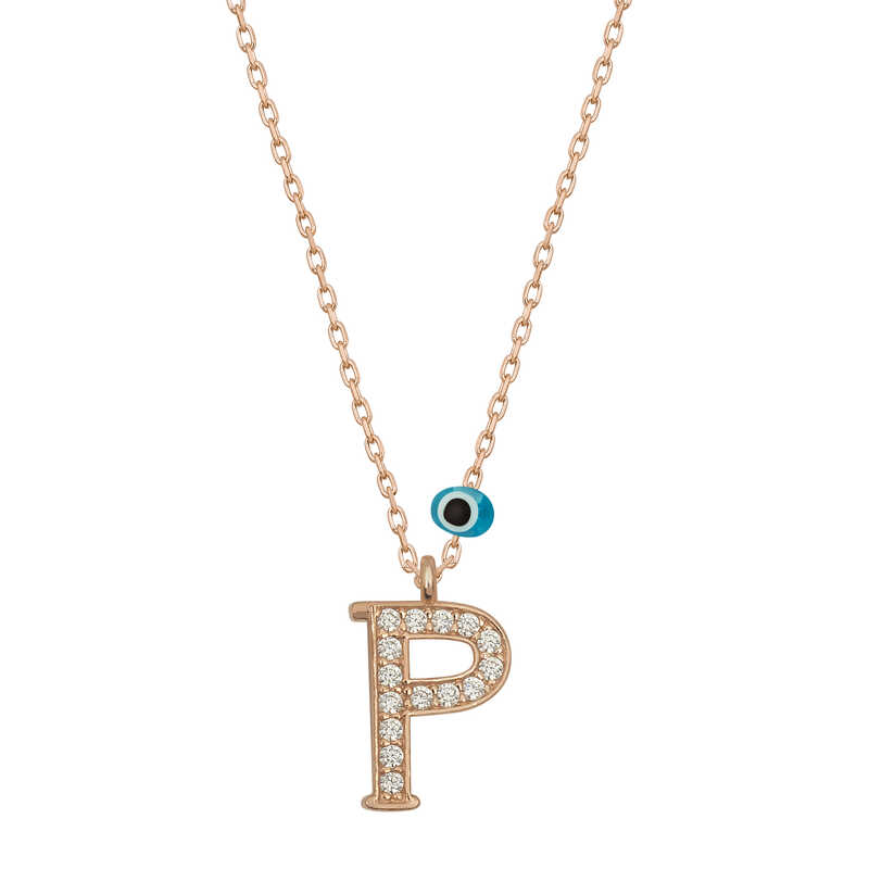 Silver Evil Eye Rose Letter P Women's Necklace With silver letter necklaces, those who are precious to you are always with you... Decorate your loved one's neck with love with this special necklace model that young lovers can choose on special occasions. A silver letter necklace that your loved ones will wear with pleasure will be one of the most meaningful gifts. The evil eye letter women's necklace model is made of 925 sterling silver. Rose plated silver. Rose plated silver women's necklace models preserve their shine for a long time. As with all of our products, the silver women's letter necklace model is handmade. Due to silver and precious stones, there may be ± 10% deviation from the average product weight. Width: 0.80 cm Length: 1.10 cm Avg. Weight: 1.40 gr