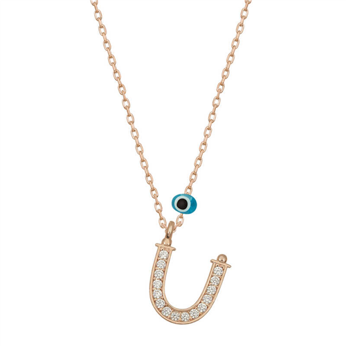 Silver Evil Eye Rose Ü Letter Women's Necklace With silver letter necklaces, those who are precious to you are always with you... Decorate your loved one's neck with love with this special necklace model that young lovers can choose on special occasions. A silver letter necklace that your loved ones will wear with pleasure will be one of the most meaningful gifts. The evil eye letter women's necklace model is made of 925 sterling silver. Rose plated silver. Rose plated silver women's necklace models preserve their shine for a long time. As with all of our products, the silver women's letter necklace model is produced by hand. Due to silver and precious stones, there may be ± 10% deviation from the average product weight. Width: 0.80 cm Length: 1.10 cm Avg. Weight: 1.40 gr