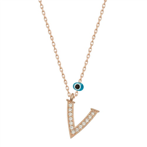 Silver Evil Eye Rose V Letter Women's Necklace With silver letter necklaces, those who are precious to you are always with you... Decorate your loved one's neck with love with this special necklace model that young lovers can choose on special occasions. A silver letter necklace that your loved ones will wear with pleasure will be one of the most meaningful gifts. The evil eye letter women's necklace model is made of 925 sterling silver. Rose plated silver. Rose plated silver women's necklace models preserve their shine for a long time. As with all of our products, the silver women's letter necklace model is handmade. Due to silver and precious stones, there may be ± 10% deviation from the average product weight. Width: 0.80 cm Length: 1.10 cm Avg. Weight: 1.40 gr