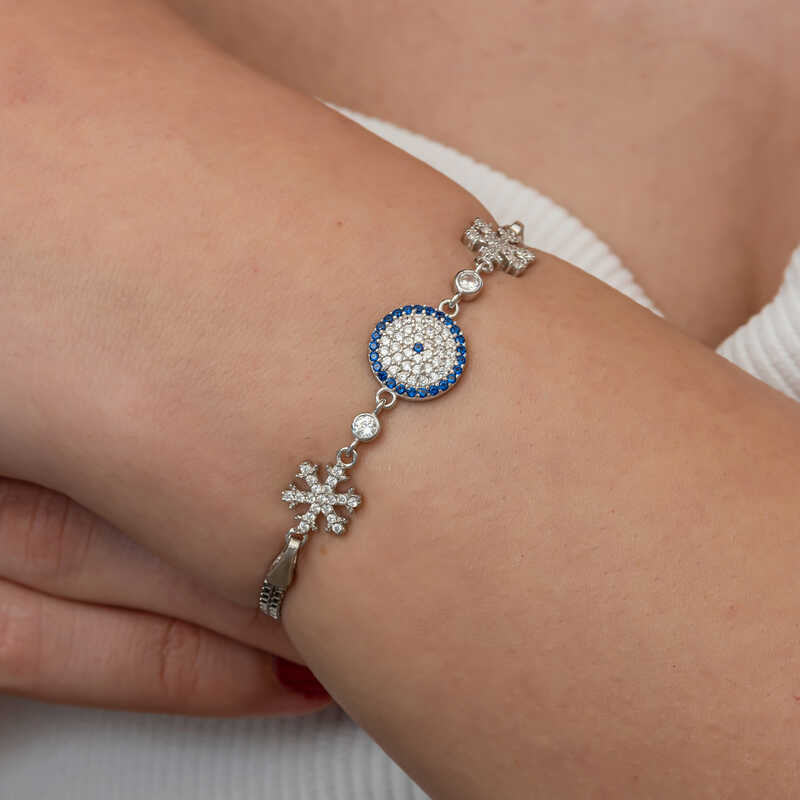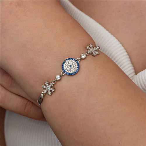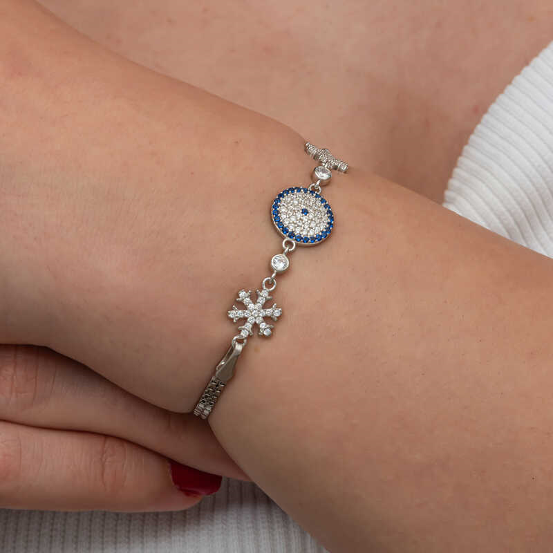 Silver Evil Eye Snowflake Women's Bracelet While the snowflake symbolizes the uniqueness of each individual, the evil eye bead aims to protect from bad energies. The sparkle and clarity of women are specially designed to resemble snowflakes. It also symbolizes that people can live happily without hurting each other, just like snowflakes. This stylish bracelet is a perfect option for a birthday gift, a Valentine's Day gift or a gift for mothers on special occasions. The bracelet is made of 925 sterling silver. Rhodium plated on silver. Rhodium plated products preserve their shine for a long time and oxidation is delayed. Like all silver bracelets, this silver evil eye snowflake women's bracelet is entirely handmade. Due to silver and precious stones, there may be a ± 10% deviation in the average product weight. Snowflake Diameter: 0.80 cm Evil Eye Diameter: 1 cm Chain Length: 20.00 cm Average Weight: 5.20 gr.