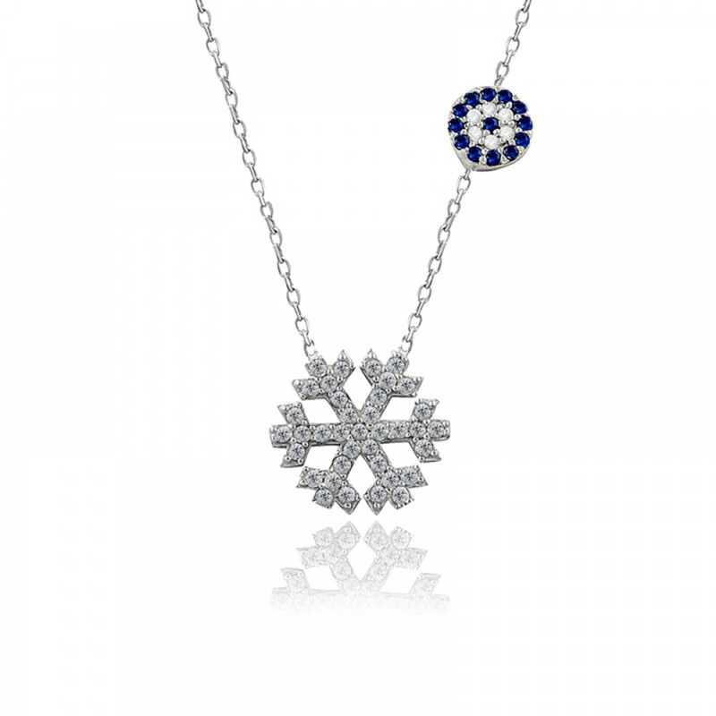 Silver Evil Eye Snowflake Women's Necklace The sparkle and clarity of women have been specially designed to resemble snowflakes. The fact that each snowflake, like women, is unique and has a different value is another feature that makes them special. The nobility of the snowflake has managed to attract attention in every period. Additionally, it symbolizes that people, just like snowflakes, can live happily without hurting each other. This stylish necklace is a perfect option for a birthday gift, Valentine's Day gift or a gift for mothers on special occasions. The necklace is made of 925 sterling silver. Rhodium plated silver. Rhodium plated products preserve their shine for a long time and oxidation is delayed. Like all silver women's necklaces, this silver rhodium evil eye snowflake women's necklace is entirely handmade. Due to silver and precious stones, there may be a ± 10% deviation in the average product weight. Width: 1.30 cm Length: 1.30 cm Average Weight: 2.10 gr. Chain Length: 45.00 cm