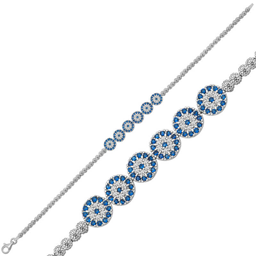 Silver Evil Eye Waterway Women's BraceletPeople have used the evil eye bead for many years to protect themselves from evil gazes. The evil eye bead is a precaution against the negative effects of evil gazes on people. For this reason, people wear evil eye beads to protect their loved ones. This evil eye bracelet reflects elegance and style. You can choose this model, which has always been popular and does not compromise on its elegance, as a birthday gift, Valentine's Day gift, or a gift for mothers on special occasions. The silver evil eye waterway women's bracelet is made of 925 sterling silver. Rhodium plated silver. Rhodium plated silver women's bracelets preserve their shine for a long time and delay oxidation. The stones on it are zircon. Like all silver women's bracelets, this silver evil eye waterway women's bracelet model is produced entirely by hand. Due to silver and precious stones, there may be a ± 10% deviation in the average product weight.Evil Eye Diameter: 0.70 cmBracelet Length: 19 cmAverage Weight: 7 gr.