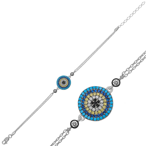 Silver Evil Eye Women's BraceletFor many years, people have used the evil eye bead to ward off evil glances. The evil eye bead is a precaution against the negative effects of evil glances on people. For this reason, people wear evil eye bead to protect their loved ones. This evil eye bracelet reflects elegance and style. You can choose this model, which has always been popular and does not compromise on its elegance, as a birthday gift, Valentine's Day gift, or a gift for mothers on special occasions. The silver evil eye women's bracelet is made of 925 sterling silver. Rhodium plated silver. Rhodium plated silver women's bracelets preserve their shine for a long time and delay oxidation. The stones on it are zircon. Like all silver women's bracelets, this silver evil eye women's bracelet model is produced entirely by hand. Due to silver and precious stones, there may be a ± 10% deviation in the average product weight.Evil Eye Diameter: 1.50 cmChain Length: 20 cmAverage Weight: 3.40 gr.