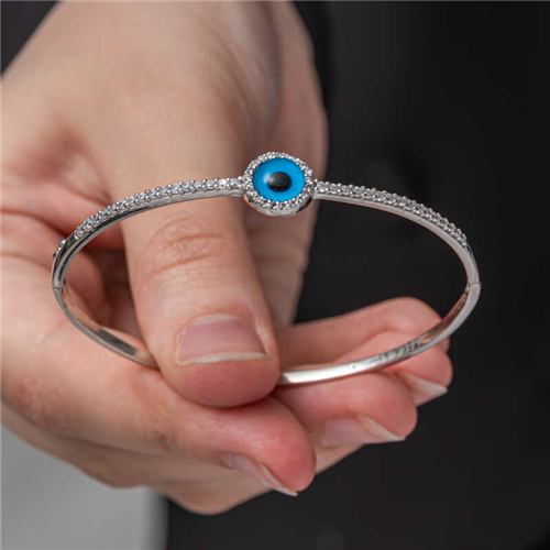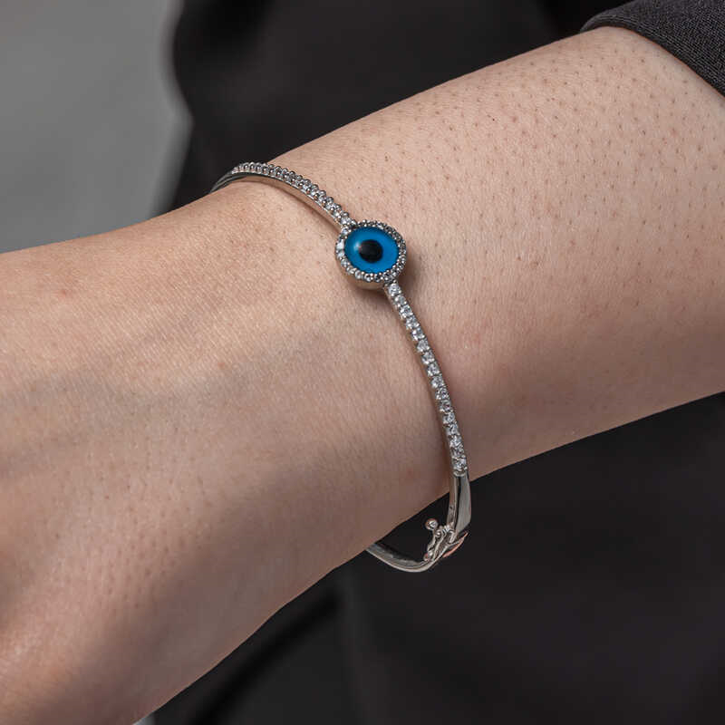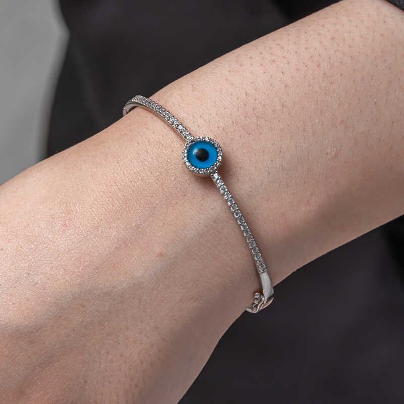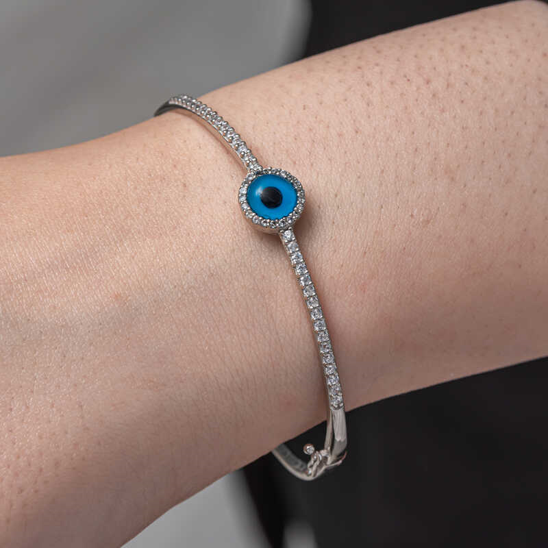 Silver Evil Eye Women's BraceletIt is an ideal option for women who love a chic and fantasy look. In the collections; the evil eye bracelet awaits you with a model suitable for every taste and concept for women who pursue showiness and elegance. You can choose this stylish model as a birthday gift or Valentine's Day gift on special occasions. The silver evil eye women's bracelet is made of 925 sterling silver. Rhodium plated silver. Rhodium-plated silver women's bracelets preserve their shine for a long time and oxidation is delayed. The stones on it are zircon. As with all silver women's bracelets, this silver evil eye women's bracelet model is also handmade. Due to silver and precious stones, there may be ± 10% deviation in the average product weight. Evil Eye Bracelet Diameter: 0.90 cmBracelet Diameter: 6 cmAverage Weight: 6.50 gr.