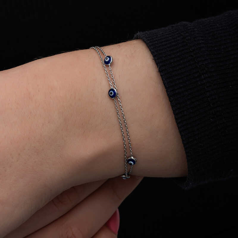 Silver Evil Eye Women's Bracelet Evil eye beads have been used for many years to protect themselves from evil gazes. The evil eye bead is a precaution against the negative effects of evil gazes on people. For this reason, people wear evil eye beads to protect their loved ones. This evil eye bracelet reflects elegance and style. Eye-catching elegance with its evil eye design... You can choose this model, which has always been popular and does not compromise on its elegance, as a birthday gift, Valentine's Day gift or a gift for mothers on special occasions. The evil eye women's bracelet is made of 925 sterling silver. Rhodium plated on the silver. Rhodium plated silver women's bracelets preserve their shine for a long time and oxidation is delayed. Like all silver women's bracelets, this silver evil eye women's bracelet is entirely handmade. Due to silver and precious stones, there may be a ± 10% deviation in the average product weight. Bracelet Width: 0.50 cm Bracelet Length: 21 cm Average Weight: 1.80 gr