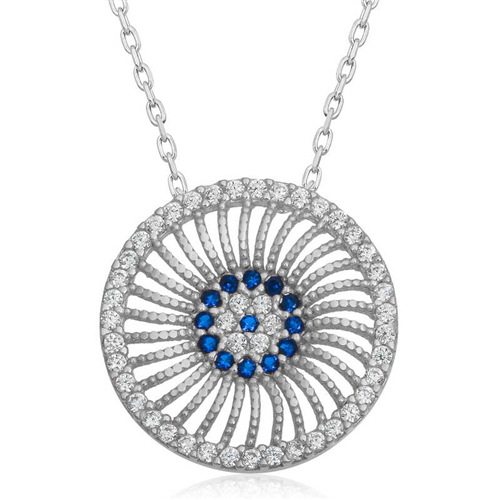 Silver Evil Eye Women's Necklace Various talismans have been used in many cultures to protect against the harms of bad energy. The talisman used in most Eastern cultures is the eye. The evil eye bead is also inspired by the shape of the eye. The choice of blue color is no coincidence. Evil eye beads are mostly designed in blue due to the belief that people with colored eyes reflect their energy more effectively. You can gift an evil eye necklace to people you dazzle with their beauty and to your loved ones who you want to protect from the evil eye. The evil eye women's necklace model is made of 925 sterling silver. Rhodium plated silver. Rhodium plated silver evil eye necklace models preserve their shine for a long time and oxidation is delayed. The stones on the necklace are zircon. This evil eye women's necklace model is handmade like all other silver women's necklace models. Due to silver and precious stones, there may be a ± 10% deviation in the average product weight. Necklace Diameter: 1.70 cm Average Weight: 2.60 gr.
