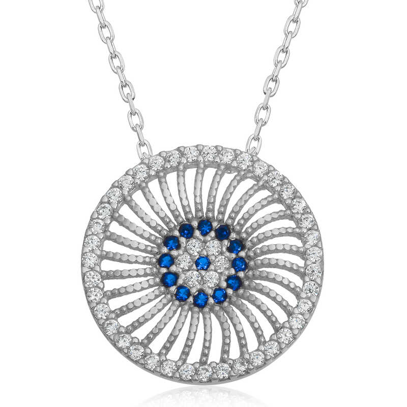 Silver Evil Eye Women's Necklace Various talismans have been used in many cultures to protect against the harms of bad energy. The talisman used in most Eastern cultures is the eye. The evil eye bead is also inspired by the shape of the eye. The choice of blue color is no coincidence. Evil eye beads are mostly designed in blue due to the belief that people with colored eyes reflect their energy more effectively. You can gift an evil eye necklace to people you dazzle with their beauty and to your loved ones who you want to protect from the evil eye. The evil eye women's necklace model is made of 925 sterling silver. Rhodium plated silver. Rhodium plated silver evil eye necklace models preserve their shine for a long time and oxidation is delayed. The stones on the necklace are zircon. This evil eye women's necklace model is handmade like all other silver women's necklace models. Due to silver and precious stones, there may be a ± 10% deviation in the average product weight. Necklace Diameter: 1.70 cm Average Weight: 2.60 gr.