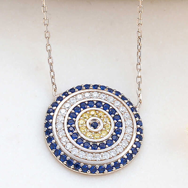 Silver Evil Eye Women's Necklace Various talismans have been used in many cultures to protect against the harms of bad energy. The talisman used in most Eastern cultures is the eye. The evil eye bead is also inspired by the shape of the eye. The choice of blue color is no coincidence. Evil eye beads are mostly designed in blue due to the belief that people with colored eyes reflect their energy more effectively. You can gift an evil eye necklace to people you dazzle with their beauty and to your loved ones who you want to protect from the evil eye. The evil eye women's necklace model is made of 925 sterling silver. Rhodium plated silver. Rhodium plated silver evil eye necklace models preserve their shine for a long time and oxidation is delayed. The stones on the necklace are zircon. This evil eye women's necklace model is handmade like all other silver women's necklace models. Due to silver and precious stones, there may be a ± 10% deviation in the average product weight. Necklace Diameter: 1.80 cm Chain Length: 45 cm Average Weight: 4.00 gr.