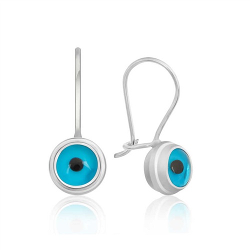 Silver Eye Dangle Rhodium Evil Eye EarringsVarious talismans have been used in many cultures to protect against the harms of bad energy. The talisman used in most Eastern cultures is the eye. The evil eye bead is also inspired by the shape of the eye. The choice of blue color is no coincidence. Evil eye beads are mostly designed in blue due to the belief that people with colored eyes reflect their energy more effectively. You can gift evil eye earrings to people who dazzle with their beauty and whom you want to protect from the evil eye and to your loved ones. This evil eye women's earring is made of 925 sterling silver. Rhodium plated on the silver. Rhodium plated silver earring models preserve their shine for a long time and oxidation is delayed. The evil eye bead on the earring is made of glass. This eye dangling earring model, like all other silver dangling earring models, is produced by hand. Due to silver and precious stones, there may be a ± 10% deviation in the average product weight.Width: 0.90 cmLength: 2.40 cmAverage Weight: 3.75 gr.