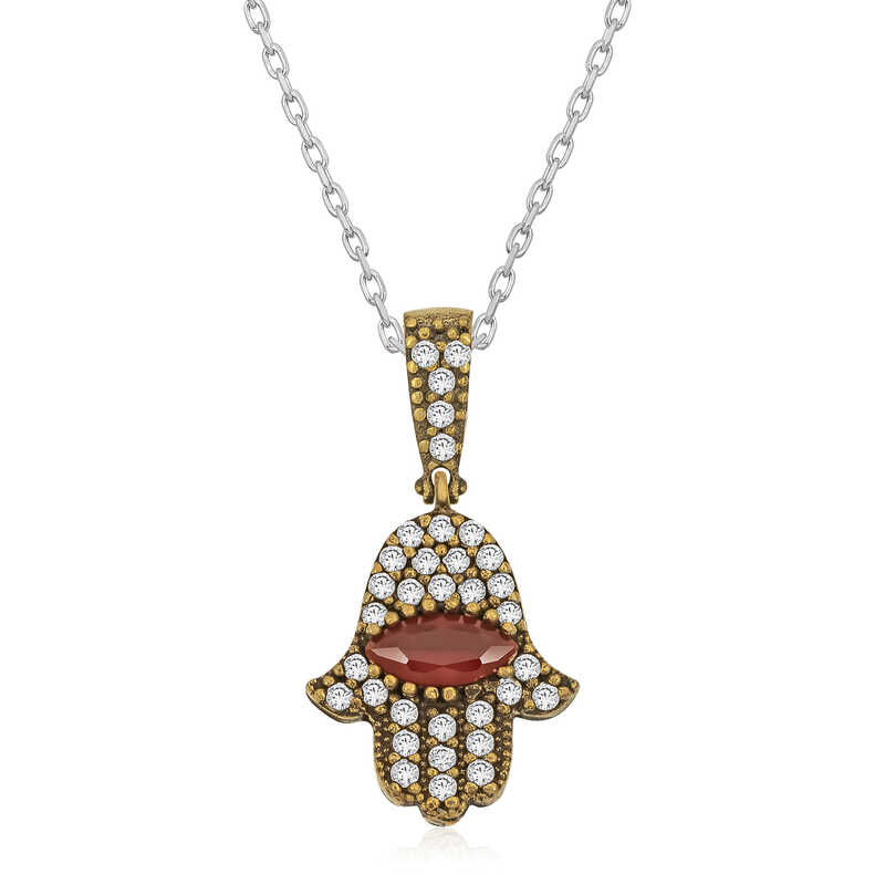 Silver Fatma Hand NecklaceThe Hand of Fatma, also known as Hamse, means five and indicates the number of fingers on a hand. Legend has it that one day, while Hz. Fatima was roasting halva in the kitchen, her husband Hz. Ali saw her dipping her hand into the cooked halva and stirring it. From that day on, it was believed that her hand was sacred, its power, and virtually invincible. Every difficulty would be overcome by her hand. This wonderful silver women's necklace model, designed inspird by this symbol, whose power is still believed in in a wide geography, is produced from 925 sterling silver and bronze metals. There is an oxide coating on the silver Fatma Hand authentic women's necklace. Authentic silver women's necklace models with oxide coating gain a worn-out look. A 45 cm long 925 sterling silver chain will come with the necklace. As with all our authentic women's necklace models, the silver Fatma Hand authentic women's necklace model is produced by hand. Due to silver and precious stones, there may be ± 10% deviation from the average product weight.Width: 1.50 cm.Height: 2.80 cm.Average Weight: 5.00 gr.