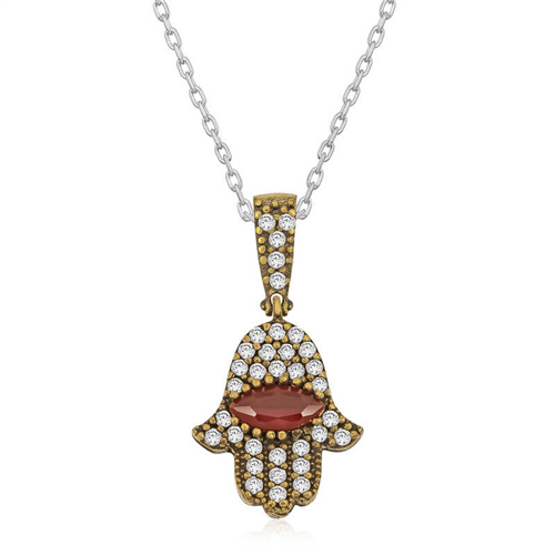 Silver Fatma Hand NecklaceThe Hand of Fatma, also known as Hamse, means five and indicates the number of fingers on a hand. Legend has it that one day, while Hz. Fatima was roasting halva in the kitchen, her husband Hz. Ali saw her dipping her hand into the cooked halva and stirring it. From that day on, it was believed that her hand was sacred, its power, and virtually invincible. Every difficulty would be overcome by her hand. This wonderful silver women's necklace model, designed inspird by this symbol, whose power is still believed in in a wide geography, is produced from 925 sterling silver and bronze metals. There is an oxide coating on the silver Fatma Hand authentic women's necklace. Authentic silver women's necklace models with oxide coating gain a worn-out look. A 45 cm long 925 sterling silver chain will come with the necklace. As with all our authentic women's necklace models, the silver Fatma Hand authentic women's necklace model is produced by hand. Due to silver and precious stones, there may be ± 10% deviation from the average product weight.Width: 1.50 cm.Height: 2.80 cm.Average Weight: 5.00 gr.