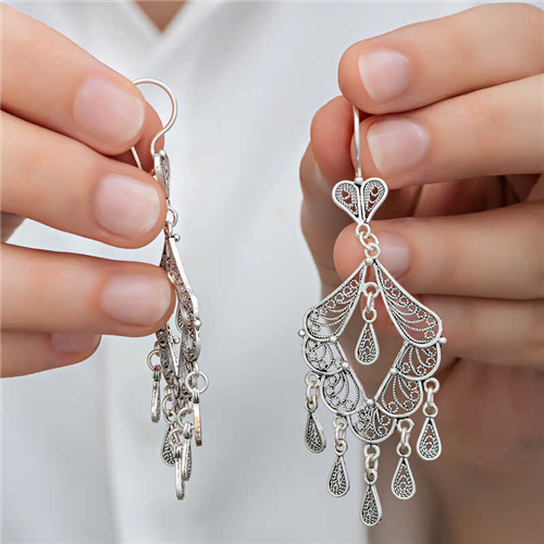 Silver Filigree Dangle Earrings for Women This specially designed handmade filigree dangling earrings for women is made of 925 sterling silver. Also known as Mardin filigree, the earring model is handcrafted by curling silver wires. You can gift the silver filigree dangling earrings for women to your lover or all your loved ones on your birthday, anniversary, New Year's Day and Valentine's Day. Due to silver and precious stones, there may be a ± 10% deviation from the average product weight. Earring Width: 2.70 cm Earring Length: 7.00 cm Average Weight: 9.80 gr.