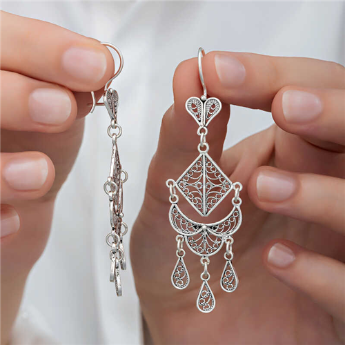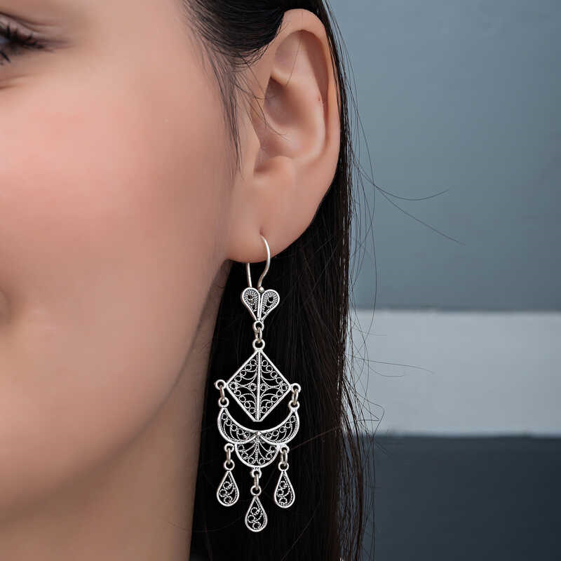 Silver Filigree Dangle Earrings for WomenThis specially designed handmade filigree dangling earring model for women is made of 925 sterling silver. Also known as Mardin filigree, the necklace model is handcrafted by curling silver wires. You can gift this silver filigree dangling earring model to your lover or all your loved ones on your birthday, anniversary, New Year's Day or Valentine's Day. Due to silver and precious stones, there may be a ± 10% deviation from the average product weight.Earring Width: 2.20 cmEarring Length: 7.00 cmAverage Weight: 7.50 gr.