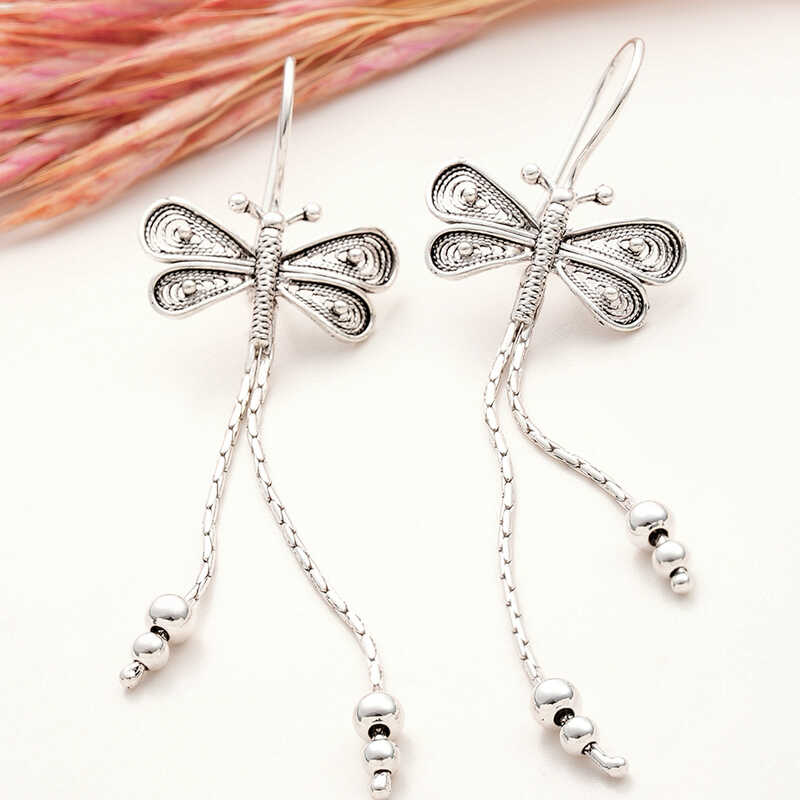 Silver Filigree Dangle Dragonfly Earrings The dragonfly represents the passion in love, commitment, and never giving up at any cost. Dragonflies are the most loyal birds in pairs. However, the female dragonfly tears off the head of the male she mates with and eats it. What a loyal love for the male dragonfly, isn't it? A dragonfly in love with fire knowingly throws itself into the fire for the sake of its love. As the fire rises into the sky, the dragonfly begins to dance around the fire with its delicate body, becoming one with the fire. Did you know that the dragonfly, wanting to touch the fire and be close to it, surrenders itself to the arms of its eternal love with the happiness of being a part of it? All of our products are handmade. Due to silver and precious stones, there may be a ± 10% deviation in the average product weight. Width: 2.20 cm Length: 8.10 cm Average Weight: 4.90 gr.