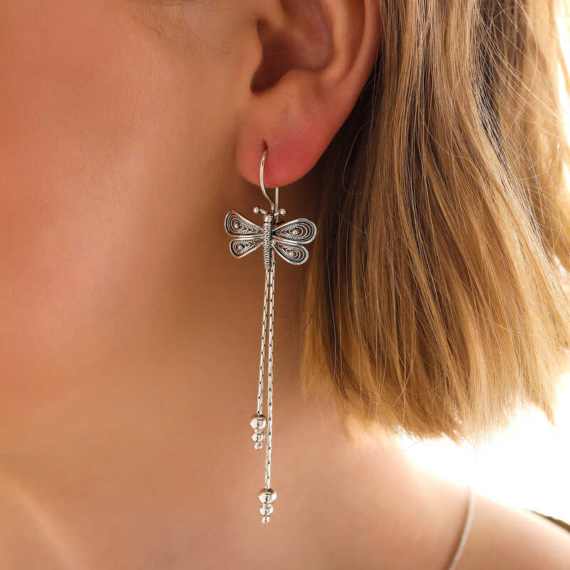 Silver Filigree Dangle Dragonfly Earrings The dragonfly represents the passion in love, commitment, and never giving up at any cost. Dragonflies are the most loyal birds in pairs. However, the female dragonfly tears off the head of the male she mates with and eats it. What a loyal love for the male dragonfly, isn't it? A dragonfly in love with fire knowingly throws itself into the fire for the sake of its love. As the fire rises into the sky, the dragonfly begins to dance around the fire with its delicate body, becoming one with the fire. Did you know that the dragonfly, wanting to touch the fire and be close to it, surrenders itself to the arms of its eternal love with the happiness of being a part of it? All of our products are handmade. Due to silver and precious stones, there may be a ± 10% deviation in the average product weight. Width: 2.20 cm Length: 8.10 cm Average Weight: 4.90 gr.