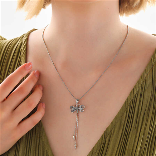 Silver Filigree Dragonfly Necklace The dragonfly represents the passion in love, commitment, and never giving up at any cost. Dragonflies are the most loyal birds in pairs. However, the female dragonfly tears off the head of the male she mates with and eats it. What a loyal love for the male dragonfly, isn't it? A dragonfly in love with fire knowingly throws itself into the fire for the sake of its love. As the fire rises into the sky, the dragonfly begins to dance around the fire with its delicate body, becoming one with the fire. Did you know that the dragonfly, wanting to touch the fire and be close to it, surrenders itself to the arms of its eternal love with the happiness of being a part of it? All of our products are handmade. Due to silver and precious stones, there may be a ± 10% deviation in the average product weight. Necklace Width: 2.20 cm Necklace Length: 7.10 cm Chain Length: 50 cm Average Weight: 5.20 gr.