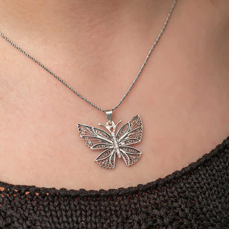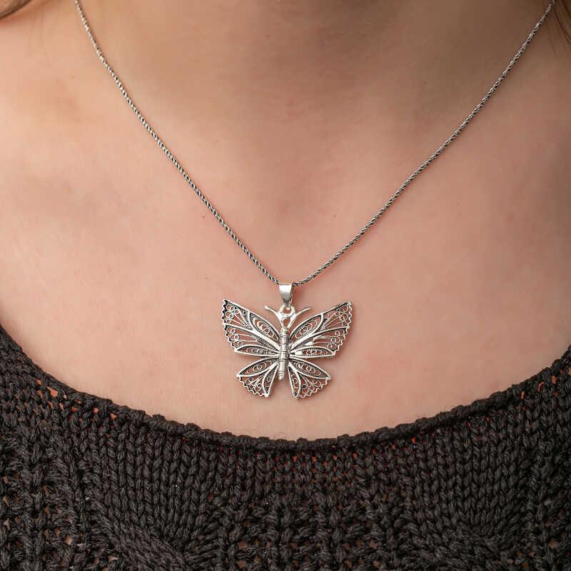 Silver Filigree Dragonfly Necklace The dragonfly represents the passion in love, commitment, and never giving up at any cost. Dragonflies are the most loyal birds in pairs. However, the female dragonfly tears off the head of the male she mates with and eats it. What a loyal love for the male dragonfly, isn't it? A dragonfly in love with fire knowingly throws itself into the fire for the sake of its love. As the fire rises into the sky, the dragonfly begins to dance around the fire with its delicate body, becoming one with the fire. Did you know that the dragonfly, wanting to touch the fire and be close to it, surrenders itself to the arms of its eternal love with the happiness of being a part of it? All of our products are handmade. Due to silver and precious stones, there may be a ± 10% deviation in the average product weight. Necklace Width: 2.20 cm Necklace Length: 7.10 cm Chain Length: 50 cm Average Weight: 5.20 gr.