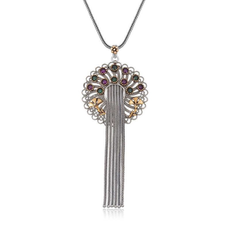 Silver Filigree Ruby Emerald Colored Stone Women's Necklace This specially designed handmade filigree women's necklace model is made of 925 sterling silver. Also known as Mardin filigree, the necklace model is handcrafted by curling silver wires. You can gift this silver filigree women's necklace model to your lover or all your loved ones on your birthday, anniversary, New Year's Day and Valentine's Day. Due to silver and precious stones, there may be a ± 10% deviation from the average product weight. Necklace Width: 3.60 cm Necklace Length: 9.00 cm Chain Length: 55 cm Average Weight: 21.00 gr.