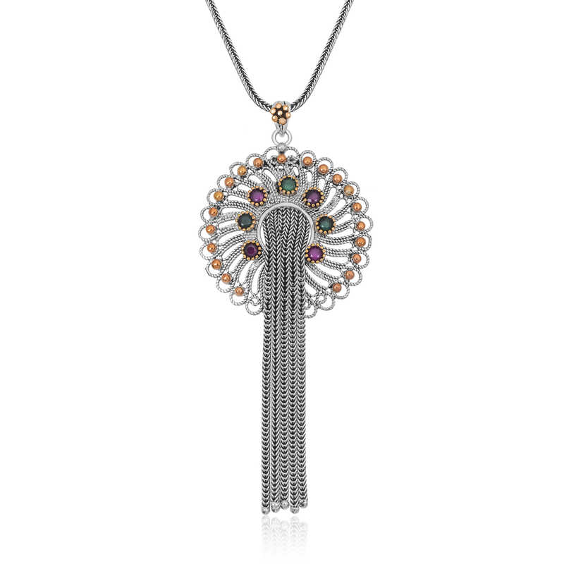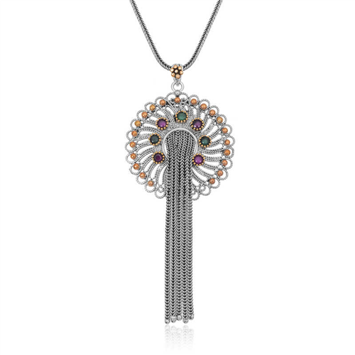 Silver Filigree Ruby Emerald Colored Stone Women's Necklace This specially designed handmade filigree women's necklace model is made of 925 sterling silver. Also known as Mardin filigree, the necklace model is handcrafted by curling silver wires. You can gift this silver filigree women's necklace model to your lover or all your loved ones on your birthday, anniversary, New Year's Day and Valentine's Day. Due to silver and precious stones, there may be a ± 10% deviation from the average product weight. Necklace Width: 3.60 cm Necklace Length: 8.50 cm Chain Length: 55 cm Average Weight: 20.00 gr.