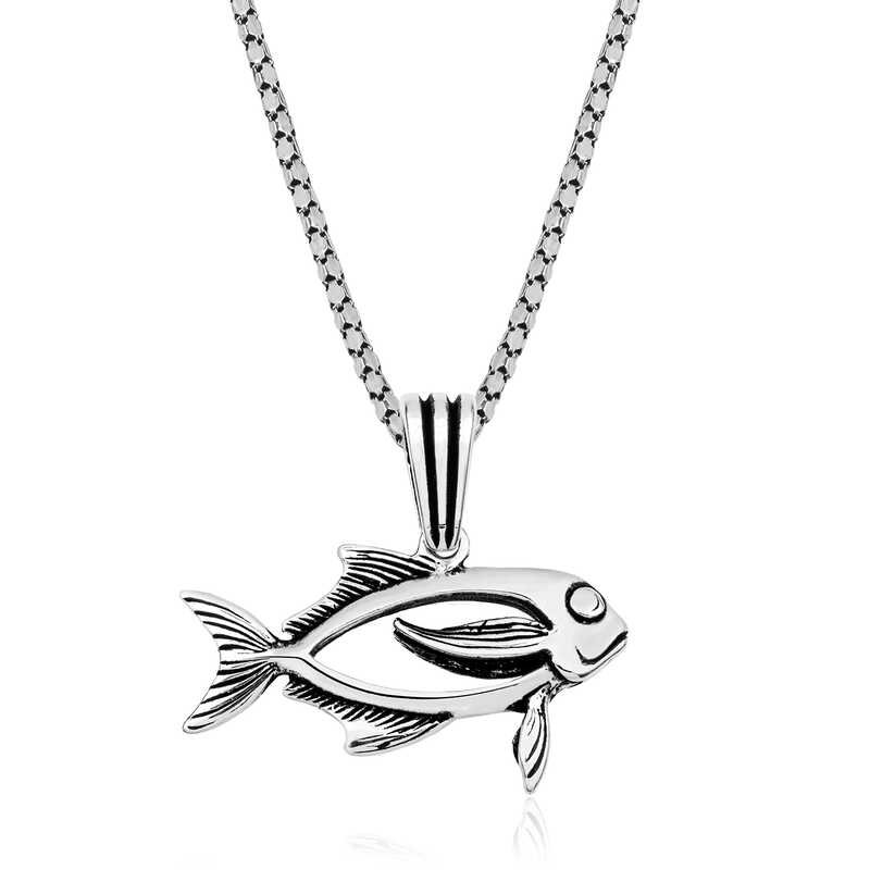 Silver Fish Men's Necklace Fish symbolizes luck and abundance in many cultures. Fish also embody many meanings related to natural life. Their ability to swim against the current, give birth in large numbers and move freely... The fish symbol, which is loaded with many meanings like these, is presented to us with its stylish design... This stylish fish necklace is a perfect option for a birthday gift or a Valentine's Day gift on special occasions. The necklace is made of 925 sterling silver. Oxide-plated necklaces preserve their shine for a long time and delay oxidation. The average chain length is 55 cm. All of our necklaces are handmade. Due to silver and precious stones, there may be a ± 10% deviation in product weight. Width: 2.80 cm Length: 3.00 cm Average Weight: 9.00 gr. Chain Length: 55 cm