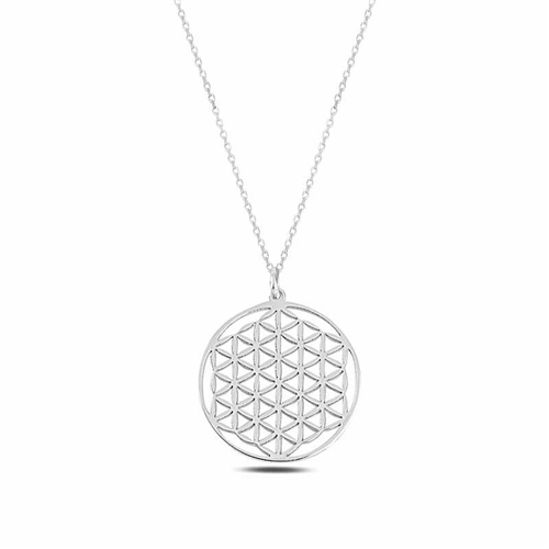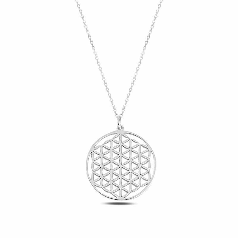 Silver Flower of Life Necklace The flower of life consists of a geometric shape consisting of many intertwined circles of equal area and a large circle outside. The center of each circle is where the circles of the six surrounding circles intersect. Drunvalo Melchizedek claims that this symbol holds the secrets of the universe and life. It is a beautiful accessory that can be enjoyed at any time of the day. Silver Flower of Life women's necklace is made of 925 sterling silver. This necklace is rhodium plated. Rhodium-plated products preserve their shine for a long time. Like all silver women's necklace models, the silver Flower of Life women's necklace is produced by hand. Due to silver and precious stones, there may be a ± 10% deviation in the average product weight. All of our products are handmade.Width: 2.40 cm Length: 2.50 cm Chain length: 45 cm Average Weight: 3.90 gr