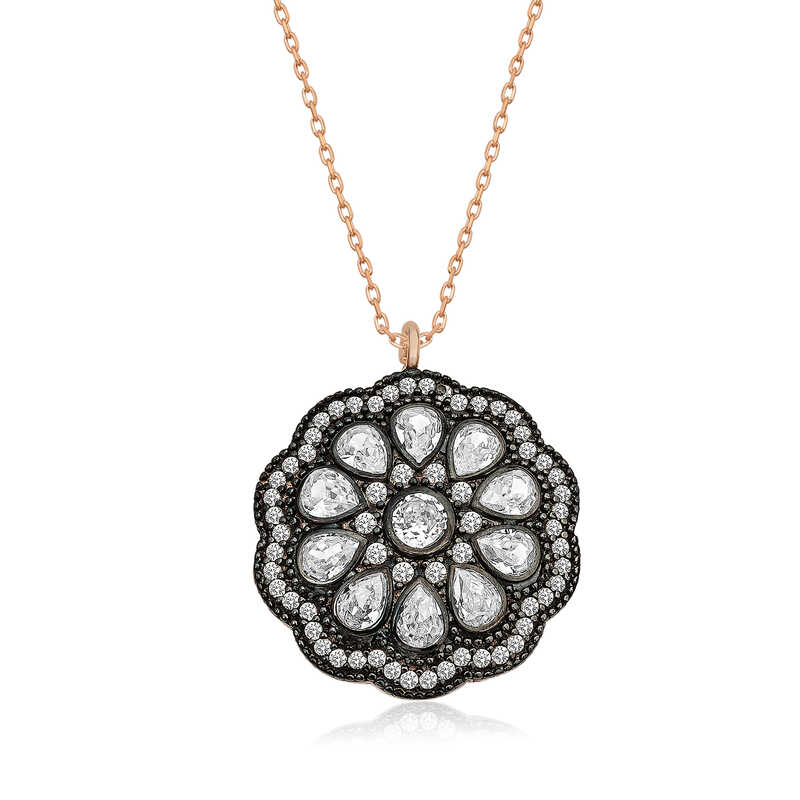 Silver Diamond Mounted Flower Women's Necklace Silver diamond mounting design necklaces, reflecting sparkle and ostentation, aim to add elegance to your style. Modernly designed silver diamond mounting flower patterned necklaces will highlight your feminine elegance. These necklaces integrate with your beauty both in daily use and at special occasions, revealing eye-catching elegance. Diamond elegance continues to convey love, passion and vitality at all ages and in all places. Beautiful silver necklaces that evoke admiration with their showiness or highlight feminine refinement with their simply elegant design are waiting for you. Rose gold plated on silver. Rose gold plated silver women's necklace models preserve their shine for a long time and oxidation is delayed. The stones on the silver necklace model are zircon. The average length of the silver chain is 45 cm. This diamond-mounted flower necklace is handmade. Due to silver and precious stones, there may be a ± 10% deviation in the specified product weight. Width: 2.00 cm Length: 2.00 cm Average Weight: 3.75 gr.