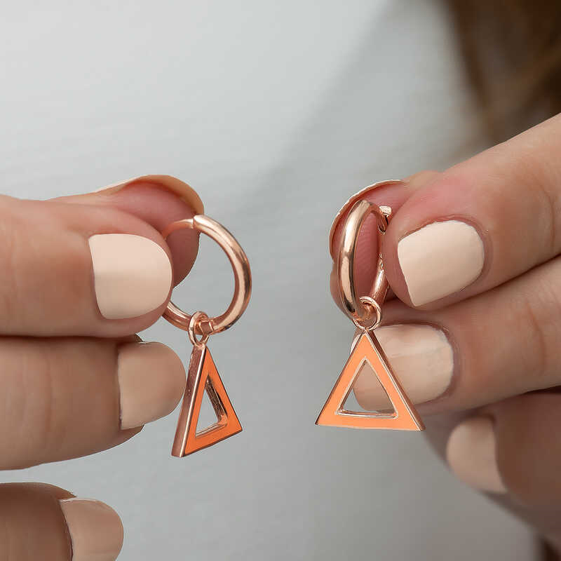 Silver Phosphorescent Orange Triangle EarringsThis collection includes the most special earring models designed in accordance with fashion for women who care about their appearance. You can create an eye-catching and fascinating style with earring models, each appealing to a different style and use. Phosphorescent orange triangle earrings are among the original models that can adapt to the style of young people and women who feel young. This earring is a perfect option for a birthday gift, Valentine's Day gift or on special occasions. Silver phosphorescent orange triangle women's earrings are made of 925 sterling silver. Rose plated silver. Rose plated silver earring models preserve their shine for a long time and oxidation is delayed. Like all women's earrings, this earring model is also handmade. Due to silver and precious stones, there may be a ± 10% deviation in the average product weight.Width: 1.50 cmLength: 2.70 cmAverage Weight: 4.60 gr.