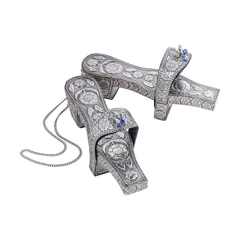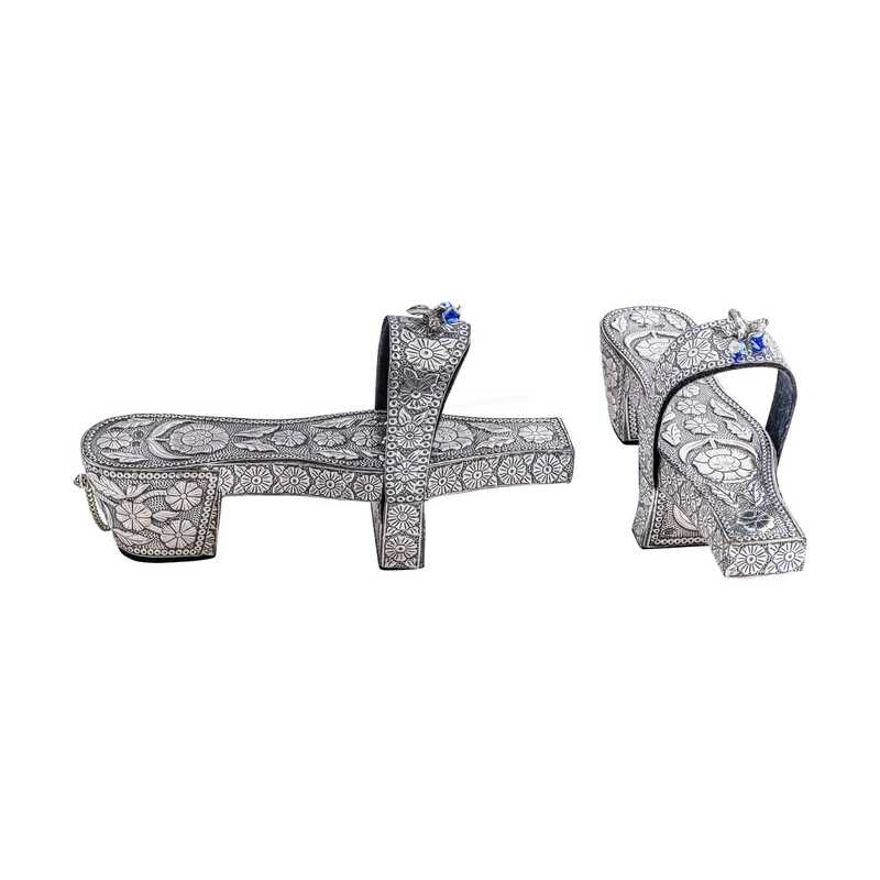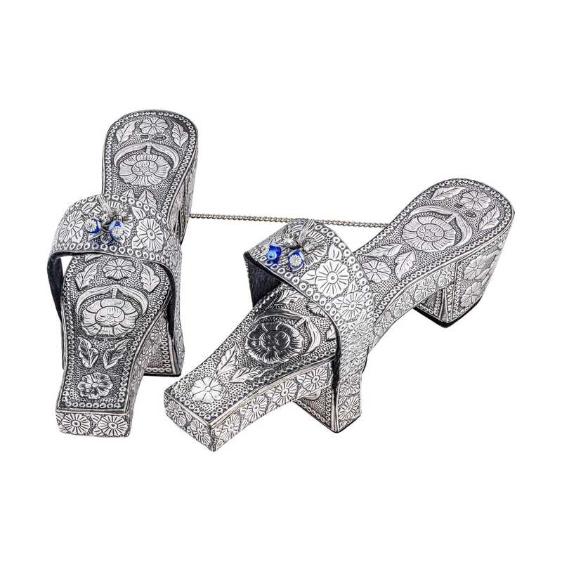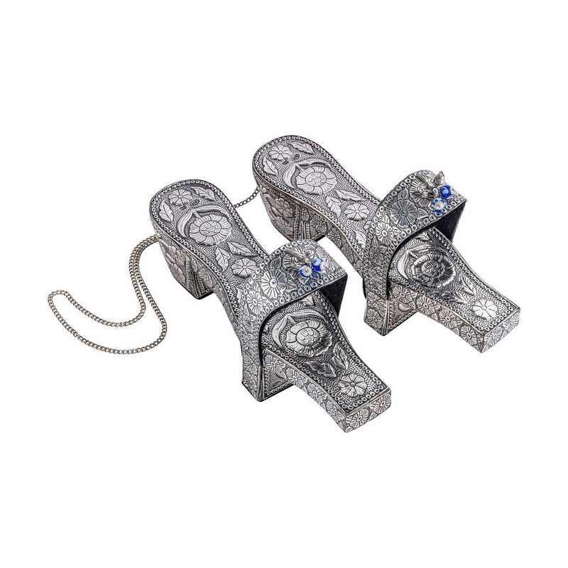 Silver Gift Clogs Clogs: Derived from the word "naleyn" which means a pair of shoes. They are made to protect the feet from the hot bath floor. Silver flower patterned clogs model is made of 925 sterling silver. Oxidized silver is coated. Oxidized silver preserves its shine for a long time, oxidation is delayed. As with all our products, this silver flower patterned clogs is produced entirely by hand. Due to silver and precious stones, there may be ± 10% deviation from the average product weight specified. Clog Width: 6 cm Clog Length: 23 cm Clog Height: 6 cm Average Weight: 464 gr.
