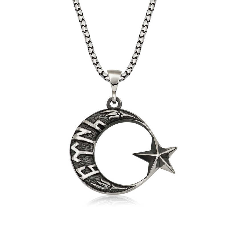 Silver Göktürk Turkish Writing Crescent and Star Men's NecklaceThe Göktürks, or the Göktürk Khaganate, are the first state established with the name "Turk" between 552 and 724. Turkish words were engraved on stones for the first time during this period. The word Turk was used for the first time in the Göktürk alphabet and was designed with a Crescent and Star necklace. The necklace is made of 925 sterling silver. Oxidized silver is coated. The oxide coating gives the silver an authentic look. As with other necklaces, the silver Göktürk Turkish Writing Crescent and Star Men's Necklace is handmade. Due to silver and precious stones, there may be ± 10% deviation from the average product weight. Width: 3.30 cm Length: 2.70 cm Avg. Weight: 11.70 gr. Average Chain Length: 55.00 cm.