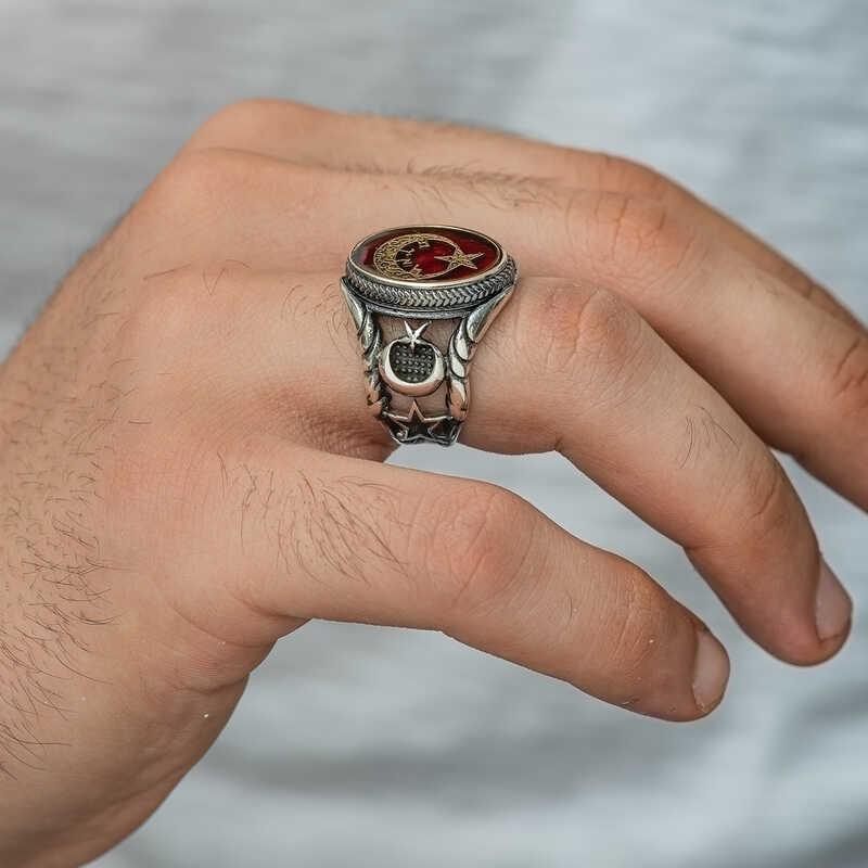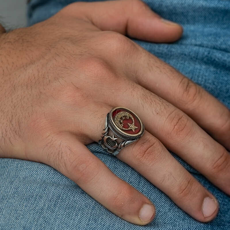 Silver Göktürkçe Turkish Script Crescent and Star Men's Ring Crescent and star or crescent-star; ancient symbol consisting of a crescent and a star at the open end of the crescent. Flags featuring this symbol are mostly found around the Mediterranean, in the Middle East, and in Central Asia. Today, it is known as a symbol mostly used in the flags of Islamic countries. The Crescent and Star symbol appears on many flags, including the Turkish flag. Although the Moon or Crescent is identified with Islam, it was also used in pre-Islamic times. The Crescent, Star, and Sun motifs provide information about the universe design of the Asian Turkic-Mongol peoples. However, the first documents depicting the Moon and Star together appeared in the Sumerian cities of Mesopotamia, in what is now Southern Iraq. The first to use the Crescent and Star motif, which clearly consists of a crescent, were the Sumerians. The Sumerians established the first state in history in Southern Iraq in 3000 BC and took a major step in the construction of today's civilization. The Sumerian language was very close to Turkish. Their beliefs were also largely similar to those of the Turks. The Sumerian Moon God "Nana-Suen" and the Sun God "Utu" or Goddess Inana's symbols were shown together, creating the first Crescent-Star pairing. This motif has survived to this day, sometimes carved in stone reliefs, sometimes on seals, and sometimes on clay tablets. You can choose this stylish ring as a birthday gift or Valentine's Day gift on special occasions. Silver Göktürçe Turkish inscription crescent and star ring is made of 925 sterling silver. The silver is oxidized. Oxidized silver rings have an aged appearance. The crescent star is coated with red polyester. Due to silver and precious stones, there may be a ±10% deviation from the average product weight. Width: 1.50 cm Length: 2.00 cm Average Weight: 15.00 gr.