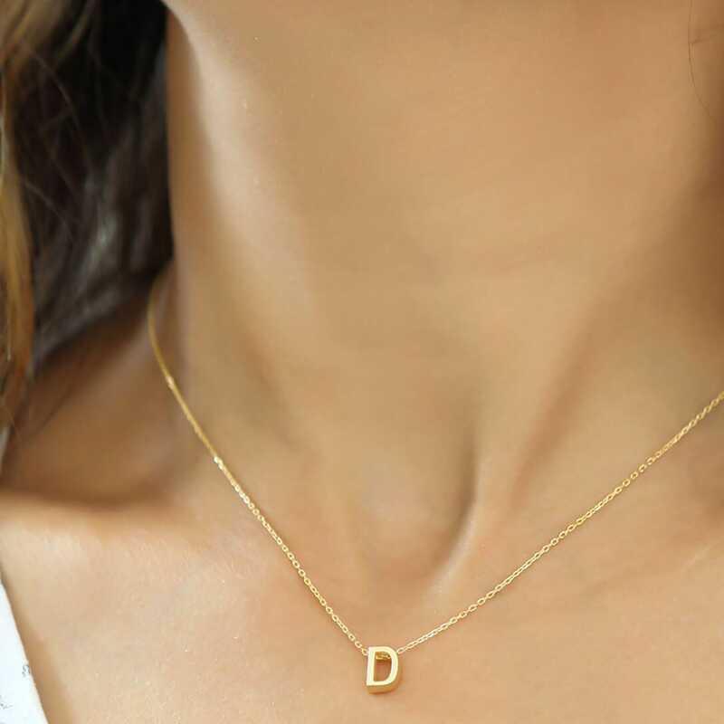 Silver Gold 3D Letter D Women's Necklace With silver letter necklaces, those who are precious to you are always with you... Adorn your loved one's neck with love with this special necklace model that young lovers can choose on special occasions. A silver letter necklace that your loved ones will wear with pleasure will be one of the most meaningful gifts. The 3D letter model is made of 925 sterling silver. Gold plating is applied on silver. Gold-plated silver women's necklace models preserve their shine for a long time. As with all of our products, the silver 3D women's letter necklace model is also handmade. There may be a ± 10% deviation in the average product weight due to silver and precious stones. Width: 0.40 cm Length: 0.40 cm Avg. Weight: 1.47 g