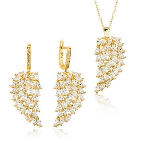 Silver Gold Angel Wing Women's SetAngels are symbols of purity and cleanliness. Therefore, the person who receives the angel set is given the message that he or she is as pure and clean as an angel. This stylish set can be chosen as a birthday gift, Valentine's Day gift or a gift for mothers on special occasions. This special angel wing design is made of 925 sterling silver. Gold plated on silver. Gold plated silver sets preserve their shine for a long time and oxidation is delayed. Like all women's silver sets, the silver angel wing women's set is handmade. Due to silver and precious stones, there may be ± 10% deviation in the specified product weight.Necklace Width: 1.50 cm.Necklace Length: 4.00 cm.Avg. Weight: 6.00 gr.Earrings Width: 1.80 cm.Earrings Length: 5.00 cmAvg. Weight: 10 gr.