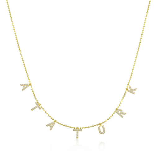 Silver and Gold Atatürk Written Women's Necklace You are faced with an unmissable necklace with the name of Mustafa Kemal Atatürk, the founder and first president of the Republic of Turkey, to carry with you at all times and to share with your loved ones. Due to its meaning, it will be one of the stylish gifts you can gift to your loved ones. This meaningful necklace is made of 925 sterling silver. The silver Atatürk written women's necklace is gold-plated. Gold-plated silver women's necklace models preserve their shine for a long time. Like all silver women's necklace models, the silver Atatürk written women's necklace model is produced by hand. Due to silver and precious stones, there may be a ± 10% deviation in the specified product weight. Letter Width: 0.70 cm Letter Length: 0.50 cm Chain Length: 45 cm Average Weight: 4.00 gr