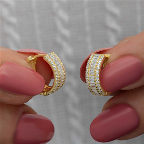 Silver Gold Baguette Row Stone Hoop EarringsThe gold baguette row stone hoop earrings, created with minimal fine lines that can be used in all areas of life, are waiting for you to add sparkle and elegance to your outfits. Different trendy designs are released every year. This year's most popular models stand out as products with multiple stones. You can add these stylish earrings to your jewelry box or consider them as a gift for a loved one. The stylish baguette stone hoop earrings are made of 925 sterling silver. Gold plated over silver. Gold plated silver earrings preserve their shine for a long time and oxidation is delayed. The stones on them are zircon and baguette. Like all women's silver products, the silver gold baguette row stone hoop earrings are produced by hand. Due to silver and precious stones, there may be a ± 10% deviation in the average product weight.Earring Thickness: 0.50 cmEarring Diameter: 1.80 cmAverage Weight: 3.20 gr.