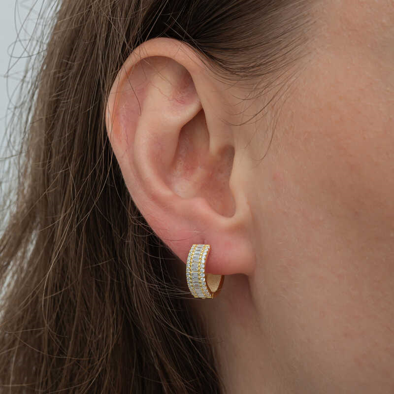 Silver Gold Baguette Row Stone Hoop EarringsThe gold baguette row stone hoop earrings, created with minimal fine lines that can be used in all areas of life, are waiting for you to add sparkle and elegance to your outfits. Different trendy designs are released every year. This year's most popular models stand out as products with multiple stones. You can add these stylish earrings to your jewelry box or consider them as a gift for a loved one. The stylish baguette stone hoop earrings are made of 925 sterling silver. Gold plated over silver. Gold plated silver earrings preserve their shine for a long time and oxidation is delayed. The stones on them are zircon and baguette. Like all women's silver products, the silver gold baguette row stone hoop earrings are produced by hand. Due to silver and precious stones, there may be a ± 10% deviation in the average product weight.Earring Thickness: 0.50 cmEarring Diameter: 1.80 cmAverage Weight: 3.20 gr.