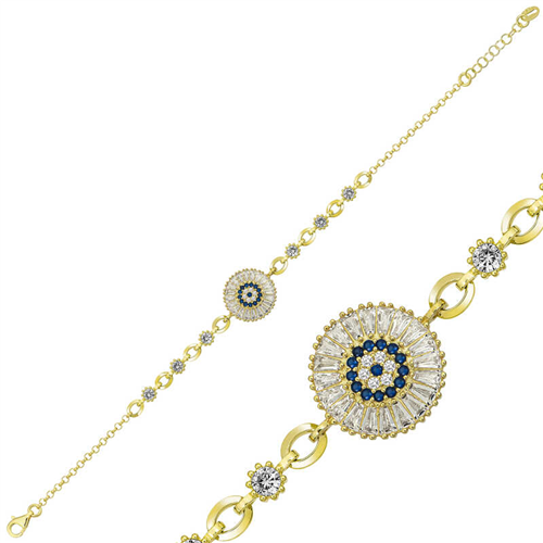 Silver and Gold Baguette Stone Evil Eye Women's Bracelet You can use our fashion-friendly silver baguette bracelet models in an elegant way both in your daily life and on special days and nights. You can complete your outfits with innovative products that appeal to the taste of women of all ages. With designs that each appeal to a different style, you can choose our models that suit your sporty, classic and alternative clothing styles. This stylish bracelet is a perfect option for a birthday gift, a Valentine's Day gift or for special occasions. The silver baguette stone evil eye women's bracelet is made of 925 sterling silver. This bracelet is gold-plated. Gold-plated products preserve their shine for a long time and delay oxidation. Like all silver women's bracelet models, the silver baguette stone women's bracelet model is also handmade. Due to silver and precious stones, there may be a ± 10% deviation in the average product weight. Evil Eye Bracelet Diameter: 1.50 cm Average Length: 21.00 cm Average Weight: 6.50 gr.