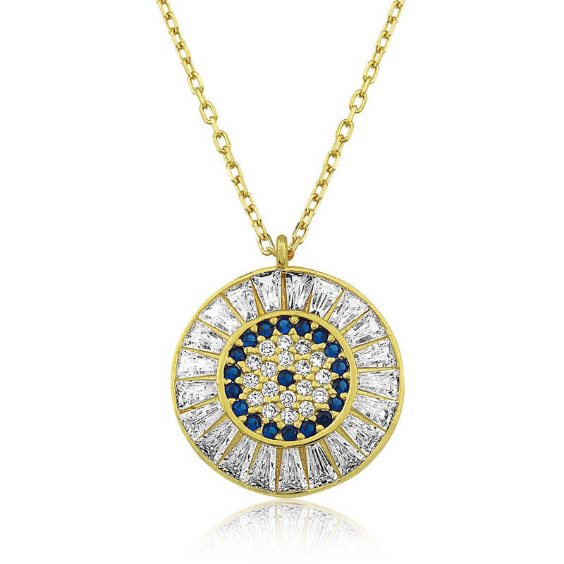 Silver and Gold Baguette Stone Evil Eye Women's Necklace People have used the evil eye bead for many years to protect themselves from evil looks. The evil eye bead is a precaution against the negative effects of evil looks on people. For this reason, people wear the evil eye bead to protect their loved ones. This evil eye necklace reflects elegance and style. You can choose this model, which has always been popular and does not compromise on its elegance, as a birthday gift, Valentine's Day gift or a gift for mothers on special occasions. The silver evil eye women's necklace is made of 925 sterling silver. Gold plated over silver. Gold plated silver women's necklaces preserve their shine for a long time and oxidation is delayed. The stones on it are baguettes and zirconias. Like all silver women's necklace models, this silver baguette stone evil eye women's necklace model is entirely handmade. Due to silver and precious stones, there may be a ± 10% deviation in the average product weight. Width: 1.50 cm Length: 1.50 cm Average Weight: 2.51 gr. Chain Length: 45.00 cm