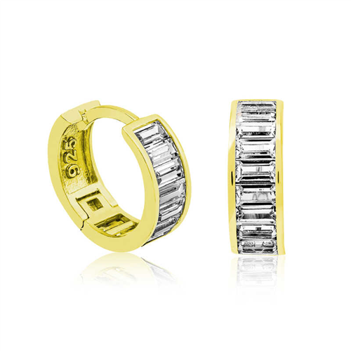 Silver Gold Baguette Stone Hoop EarringsGold baguette stone hoop earrings, created with minimal fine lines that can be used in all areas of life, are waiting for you to add sparkle and elegance to your outfits. Different trendy designs are released every year. This year's most popular models stand out as baguette stone products. You can add these stylish earrings to your jewelry box or consider them as a gift for a loved one. The stylish baguette stone hoop earrings are made of 925 sterling silver. Gold plated over silver. Gold plated silver earrings preserve their shine for a long time and oxidation is delayed. The stones on them are baguettes. Like all women's silver products, the silver rose baguette stone hoop earrings are produced by hand. Due to silver and precious stones, there may be a ± 10% deviation in the average product weight.Earring Thickness: 0.50 cmEarring Diameter: 1.50 cmAverage Weight: 3.60 gr.