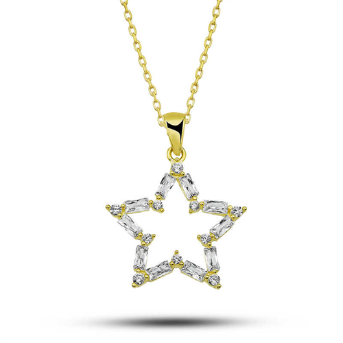 Silver and Gold Baguette Stone Star Women's Necklace The star is an auspicious symbol believed to bring luck in many societies and teachings. It carries the energy of the Planet Venus. The Planet Venus is also the representative of the energy of love and romance. This stylish star necklace made of baguette stones is a perfect option for a birthday gift, Valentine's Day gift or on special occasions. Silver and gold baguette stone star women's necklace is made of 925 sterling silver. This necklace is gold plated. Gold plated silver women's necklace models preserve their shine for a long time. As with all our silver women's necklace models, the silver and gold baguette stone star women's necklace model is produced by hand. Due to silver and precious stones, there may be ± 10% deviation in the average product weight. Width: 1.70 cm Length: 1.70 cm Average Weight: 2.10 gr. Chain Length: 45.00 cm