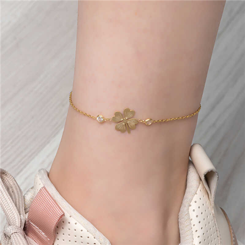 Silver Gold Clover Zircon Stone AnkletAlthough jewelry usually comes to mind for women, it has influenced both men and women throughout history. Jewelry, worn by women to appear more elegant and attractive and by men for style, not only represents social status, personality, beliefs, and identity, but also has various functions. In Anatolia, women working in vineyards, gardens, and fields could easily find their young children's locations by the sound made from anklets they wore. Anklets were also used to deter poisonous animals such as snakes and scorpions from approaching thanks to the sound they made. Today, they are worn by women who want to look elegant and stylish. Don't deprive your wrists of this elegance and visit our anklet section to choose your favorite model. The clover zircon stone anklet is made of 925 sterling silver. The silver is gold-plated. Gold-plated anklets for women preserve their shine for a long time, transforming silver to gold and delaying oxidation. All of our products are handmade. Due to the silver and precious stones, product weight may vary by ±10%.Clover Width: 1.40 cmClover Length: 1.50 cmAnklet Chain Length: 27 cmAverage Weight: 2.30 gr.